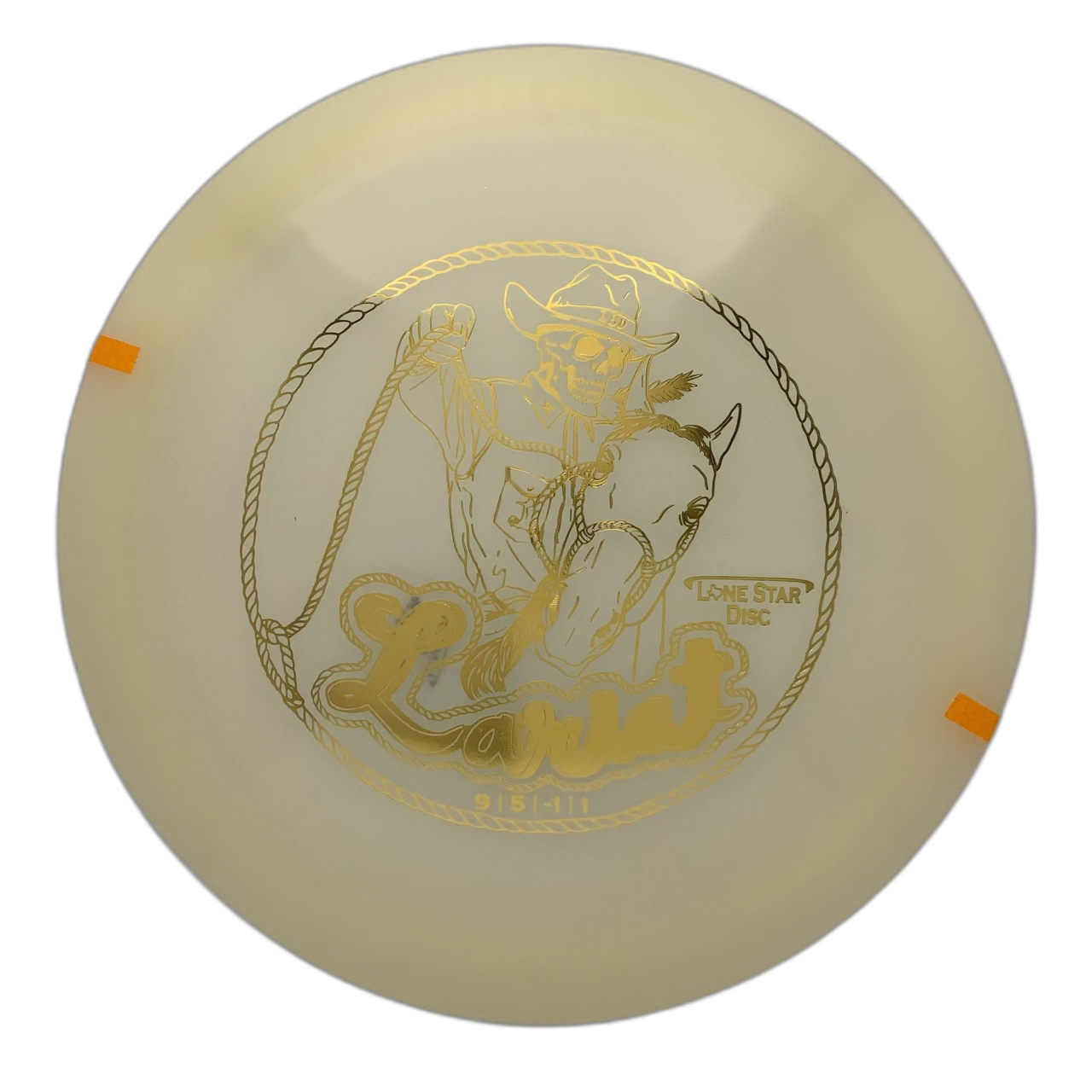 The Lone Star Lariat is a straight-flying fairway driver that can be thrown on a rope. It has a shallow rim depth that makes it ideal for any player no matter their experience level. 9 | 5 | -1 | 1